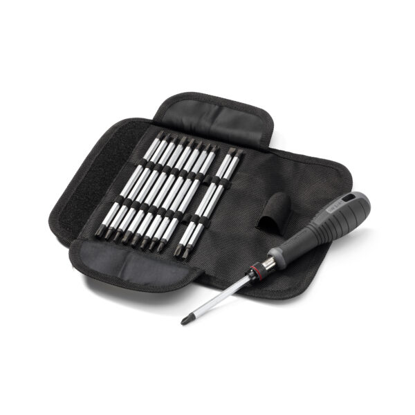 Hultafors lange bitset in opvouwbare etui van textiel. De bitlengte kan worden aangepast door ze in het handvat te steken. Deze set is als volgt samengesteld: