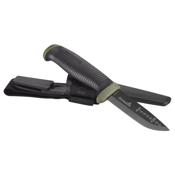 - De rug van het lemmet is geribbeld voor gebruik met een vuursteen en in het lemmet is een meetlint gegraveerd, ideaal voor outdoor gebruik