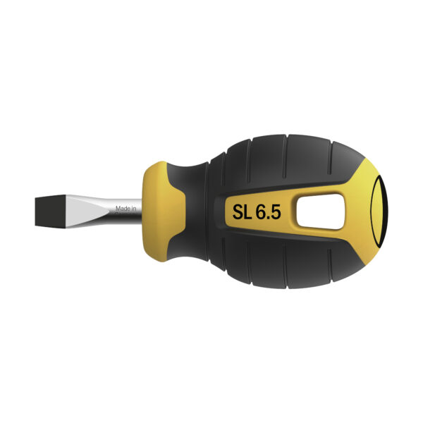 Hultafors Stubby sleufschroevendraaier met korte kling en compact handvat voor geoptimaliseerde toegang in krappe ruimtes. Het handvat is gemaakt van duurzaam PPC-plastic met een coating van slijtvast en gemakkelijk vast te houden rubber. De handgreep van de bitschroevendraaier heeft een gat om op te hangen of vast te zetten. Het ontwerp van de handgreep voorkomt dat de schroevendraaier over hellende oppervlakken rolt.
