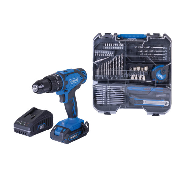 De compacte boormachine beschikt over twee krachtige snelheden met traploze toerentalinstelling en een maximaal koppel van 50 Nm. Deze boormachineset wordt geleverd in een robuuste draagkoffer inclusief accu, oplader en een 74-delige accessoireset. Alle accu’s en laders uit de Scheppach IXES 20 Volt-serie kunnen worden gecombineerd met deze boormachine.