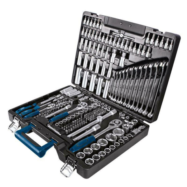 Scheppach TB217 is een compacte gereedschapsset vol hoogwaardig en gesorteerd schroefgereedschap, inclusief 3 ratels met verlengstukken, steeksleutels, inbussleutels, schroevendraaiers met bithouder en diverse bits en dopsleutels. De gereedschappen zijn gemaakt van hoogwaardig chroom-vanadium staal en bijzonder resistent en duurzaam.