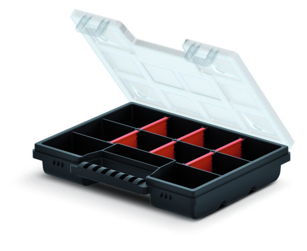 Deze praktische Skandia organizer met opbergvakken is gemaakt van zeer sterk polymeer met een transparant deksel van polycarbonaat. De fucntionele tussenschotten vallen extra op vanwege hun kleur. De handgreep heeft mooie ronde ergonomische vormen voor een comfortabele grip.
