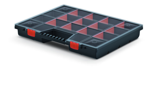 Deze praktische Skandia organizer met opbergvakken is gemaakt van zeer sterk polymeer met een transparant deksel van polycarbonaat. De fucntionele tussenschotten vallen extra op vanwege hun kleur. De handgreep heeft mooie ronde ergonomische vormen voor een comfortabele grip.
