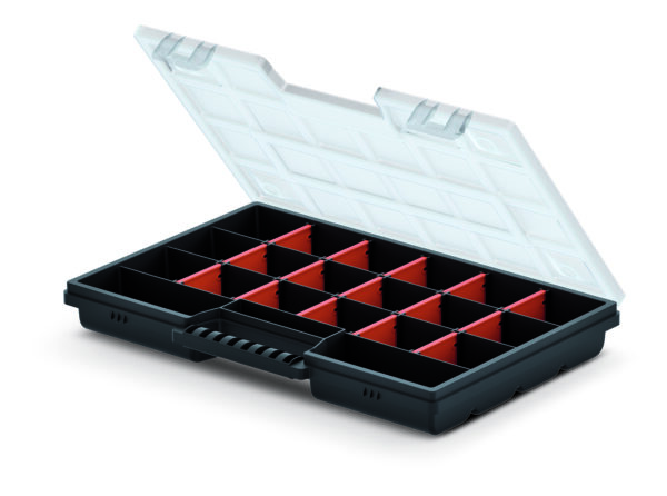 Deze praktische Skandia organizer met opbergvakken is gemaakt van zeer sterk polymeer met een transparant deksel van polycarbonaat. De fucntionele tussenschotten vallen extra op vanwege hun kleur. De handgreep heeft mooie ronde ergonomische vormen voor een comfortabele grip.