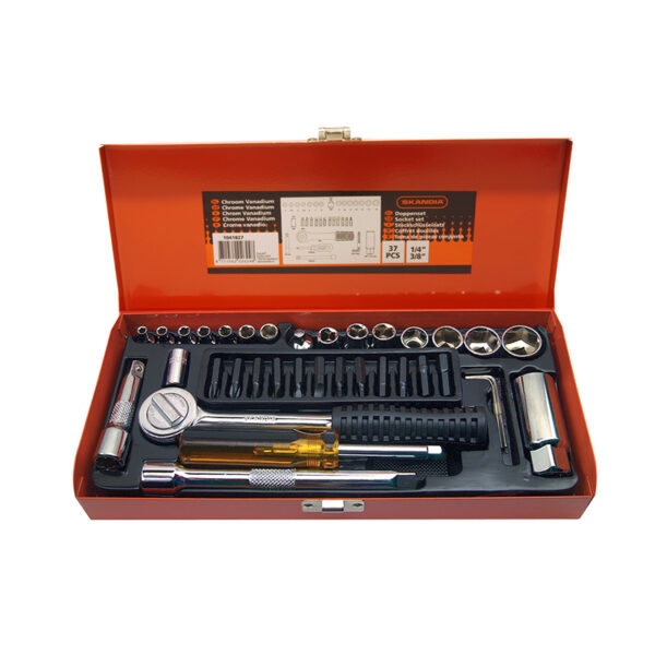 Met deze 36-delige Skandia Dopsleutelset (1/4″ en 3/8″), ook wel doppendoos genoemd, wordt een goed gevulde doppendoos in huis gehaald. Deze is bedoeld voor algemeen gebruik om moeren, schroefbouten en schroeven in en uit te draaien. Deze dopsleutelset wordt geleverd in een metalen kist, zodat de onderdelen netjes bij elkaar kunnen worden bewaard en niet zoek raken. Deze dopsleutelset is uitermate geschikt voor de wat uitgebreidere klussen in en om het huis en in de garage. De ratel ligt goed in de hand en is daardoor prettig om mee te werken.