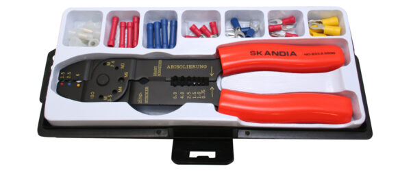 Skandia kabelschoenset, in kunststof doos, 31-delig. Heel handig om in huis te hebben. Met 30 verschillende kabelschoenen en ??n Skandia kabelschoentang met een lengte van 200 mm. Kabelschoenen worden onder andere veel gebruikt in huishoudelijke elektrische apparaten, auto’s, motoren en boten om elektrische verbindingen te maken. Veel kabelschoenen worden speciaal toegepast bij deze verbindingen omdat ze weer eenvoudig zijn los te koppelen. Een kabelschoen wordt bevestigd met een kabelschoentang (krimptang) voor het aandrukken van kabelschoentjes van 1,5 t/m 6 mm. Met deze kabelschoentang wordt de huls van de kabelschoen, waarin de elektrische draad wordt gestoken, plat geperst (krimpen), waardoor een verbinding ontstaat tussen de draad met het kabelschoen.