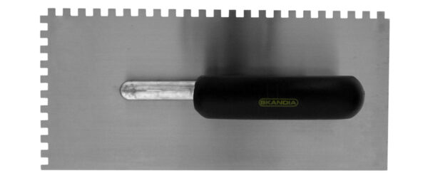 Met de Skandia RVS getande plakspaan, ook wel lijmverdeler, lijmverdelingsplakspaan, lijmspaan, kitverdeler of kartelspaan genoemd wordt met de gladde kant van de kitverdeler de nodige hoeveelheid bouwlijm op een ondergrond aangebracht, waarna deze bouwlijm met de juiste vertanding over de ondergrond wordt verdeeld. Uitgevoerd uit roestvaststaal met vertanding van 8 x 8 mm aan de ene lange- en korte zijde een getande kant. Aan de andere lange- en korte zijde een gladde kant.