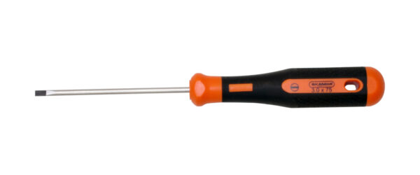 Deze Skandia schroevendraaier, sleufmodel, is voorzien van een zwart/oranje greep met ophanggat welke gemaakt is van comfortabel 2-componenten kunststof. Ergonomisch gevormd voor optimale grip en krachtoverbrenging.