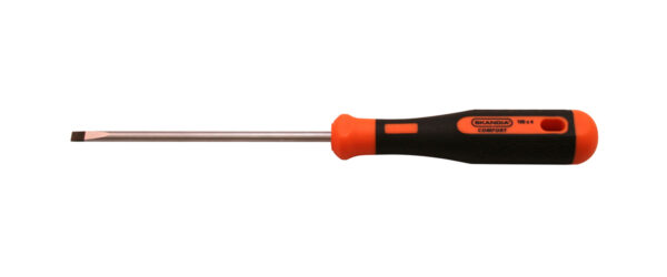 Deze Skandia schroevendraaier, sleufmodel, is voorzien van een zwart/oranje greep met ophanggat welke gemaakt is van comfortabel 2-componenten kunststof. Ergonomisch gevormd voor optimale grip en krachtoverbrenging.