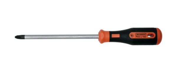 Deze Skandia extra lange kruiskopschroevendraaier, ook wel sterschroevendraaier genoemd, met Phillips (PH) kruiskop is voorzien van een zwart/oranje greep met ophanggat welke gemaakt is van comfortabel 2-componenten kunststof. Ergonomisch gevormd voor optimale grip en krachtoverbrenging.