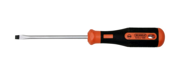 Deze Skandia schroevendraaier, sleufmodel, is voorzien van een zwart/oranje greep met ophanggat welke gemaakt is van comfortabel 2-componenten kunststof. Ergonomisch gevormd voor optimale grip en krachtoverbrenging.