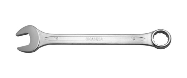Deze Skandia steekringsleutel is vervaardigd uit chroom vanadium staal, mat verchroomd, met geslepen en dunne gepolijste bek. De sleutelkop staat onder een hoek van 15? voor een optimale toegankelijkheid. Door het open einde van de steeksleutel kan ze eenvoudig over een moer of bout heen gestoken worden. De twaalfkantige ring staat 15? gebogen om de knokkels vrij te houden en biedt de mogelijkheid korte slagen (30?) te maken op plekken waar weinig bewegingsruimte is.