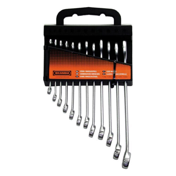 De Skandia steek-/ringsleutelset is een 12-delige set met steek-/ringsleutels in de maten 6, 7, 8, 9, 10, 11,12, 13, 14, 15, 17 en 19 millimeter. De Skandia steek-/ringsleutelset wordt praktisch en netjes bijeengehouden in een overzichtelijke kunststof houder.