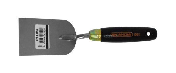 Skandia RVS stukadoorsbandtroffel, ook wel stukadoorsbandtruffel, stukadoorsschepje of stukadoorsschopje genoemd wordt gebruikt om reparaties uit te voeren en sleuven aan te smeren met pleistermortel en andere vulmiddelen. Uitgevoerd met roestvaststalen gepolijst blad welke enigszins verend is. De troffel heeft een rechte voorzijde en een zwart gelakt houten handvat met ophanggat.