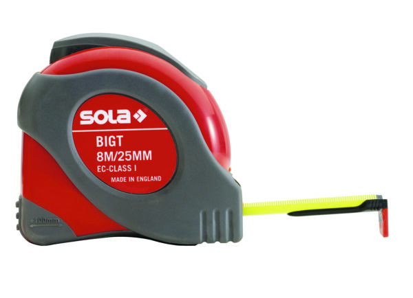 Stalen band – geel gelakt. Anti-Reflect gecoate band. Doorlopende mm maatverdeling. Automatische terugloop van de band. Tweevoudige rem . Met gepatenteerde riemclip