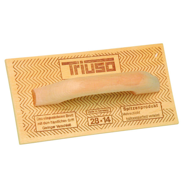 Rechthoekig houten schuurbord met een blad van 7 op elkaar gelijmde lagen en afgeschuinde zijkanten. Gesloten houten greep.